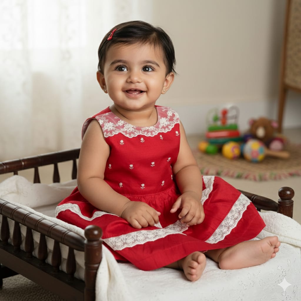 Raw silk frock with gathering. Red frock with offwhite lace work and hand-embroidery.