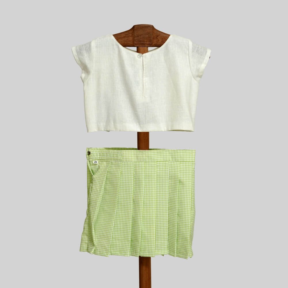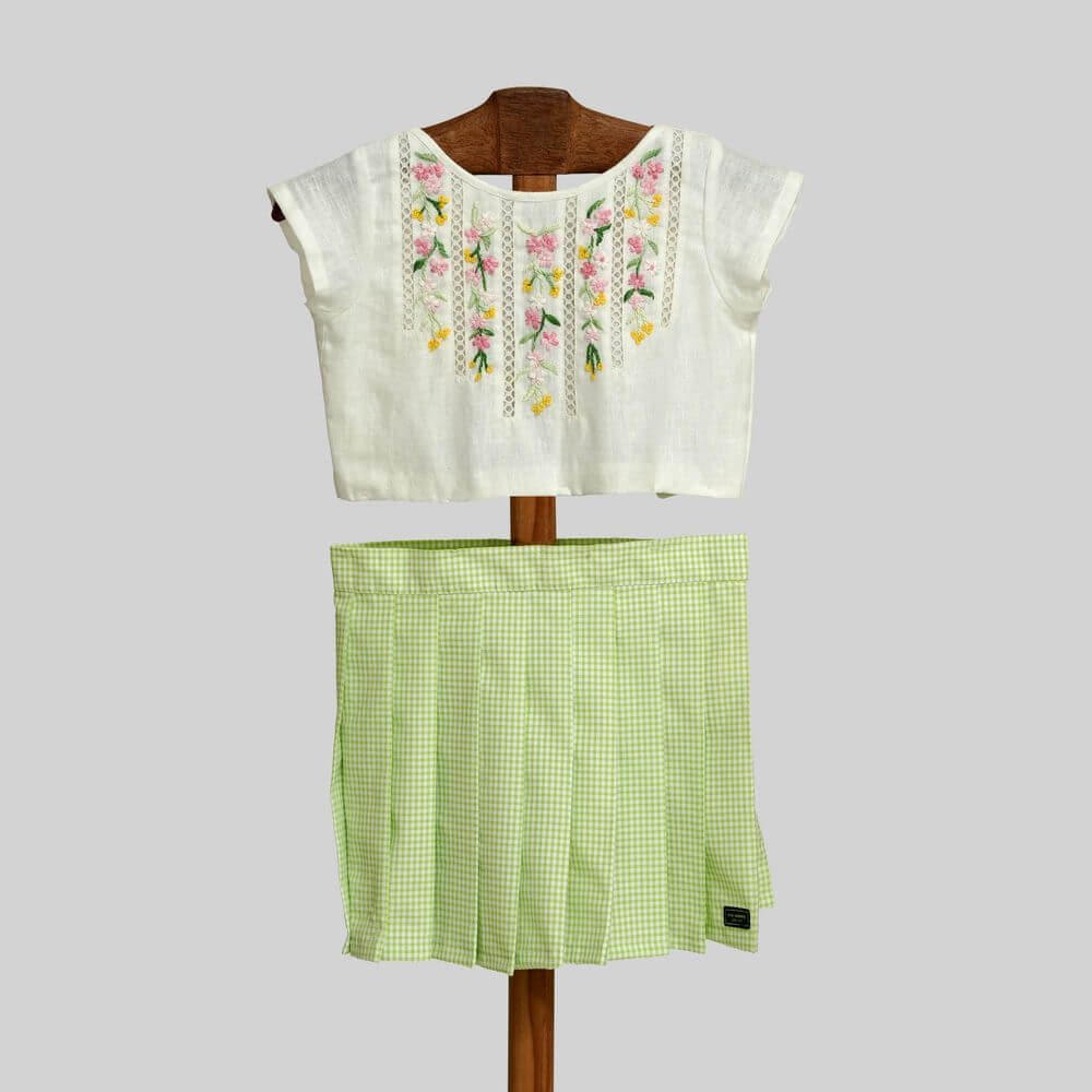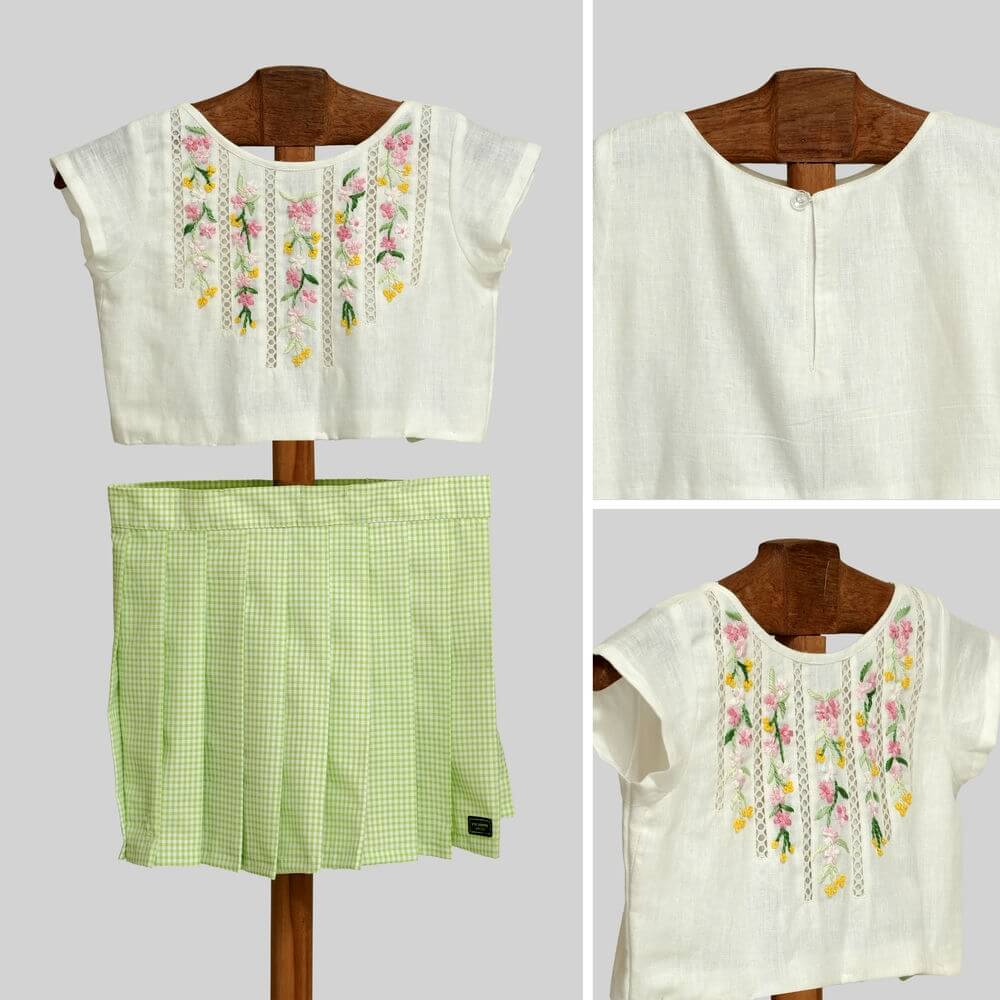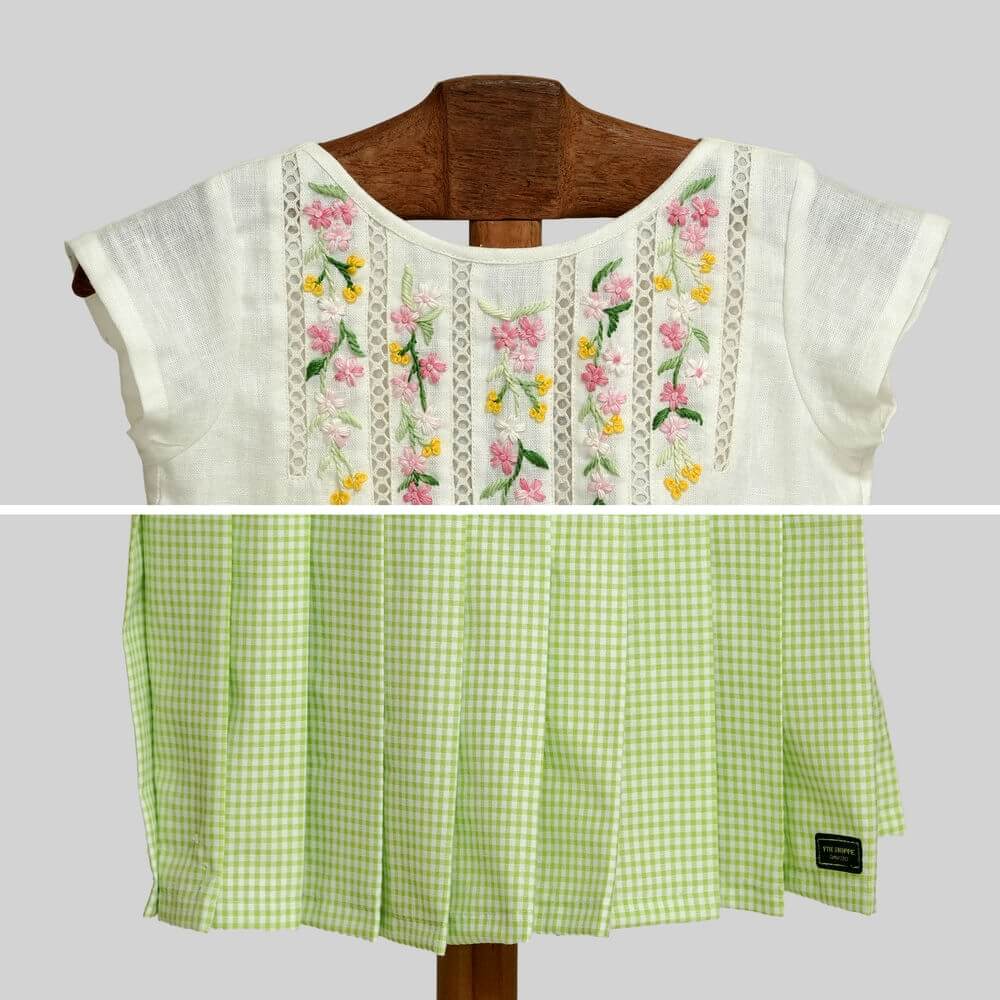 SKIRT WITH CHECK FABRIC & LINEN TOP WITH HAND EMBROIDERY