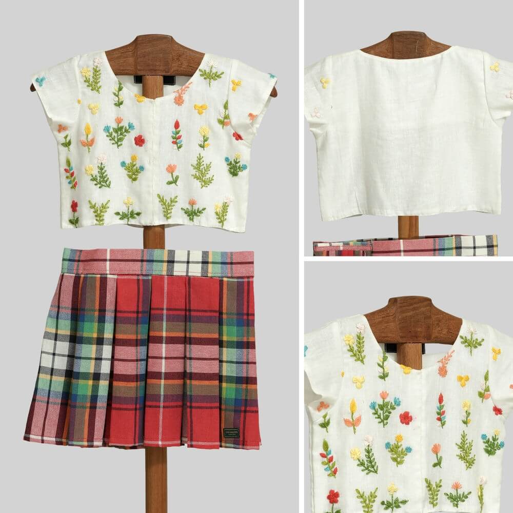 SKIRT WITH CHECK FABRIC & LINEN TOP WITH HAND EMBROIDERY